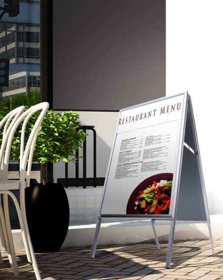 Stojak dwustronny z ostrymi narożnikami doskonale sprawdzi się jako dodatkowe wyposażenie w Twoim sklepie. Profil ramy zatrzaskowej OWZ ma szerokość 25 mm, a każda rama wyposażona jest w folię z filtrem UV.