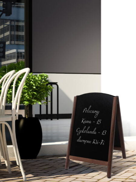 Nowoczesny i stylowy drewniany potykacz reklamowy. Stanowi idealne rozwiązanie do restauracji lub ogrodu gastronomicznego – nie tylko w okresie letnim. Drewniana rama, dostępna jest w trzech kolorach, które doskonale komponują się brązową powierzchnią do pisania.
