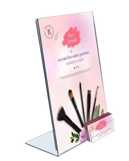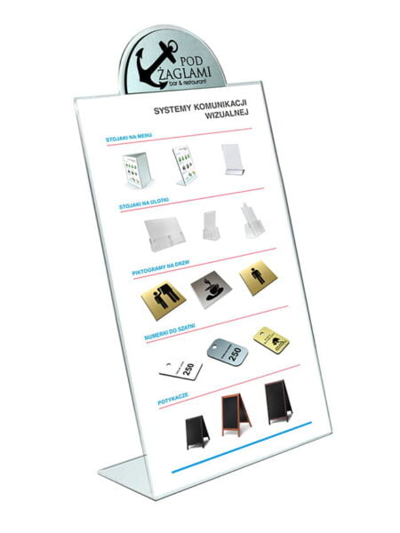 Stojak informacyjny na ulotkę DL z logo – stojaki na menu typ L wykonane z najwyższej jakości plexi Akrylon XT.