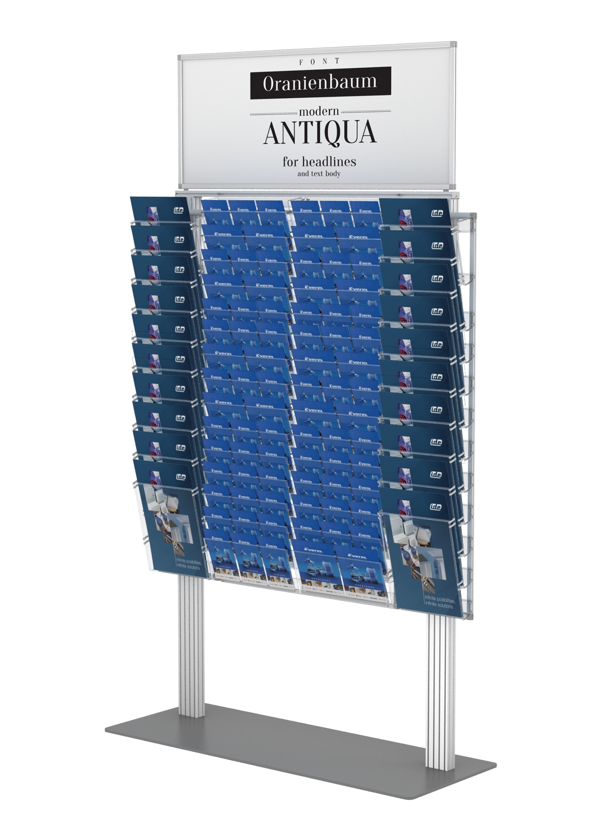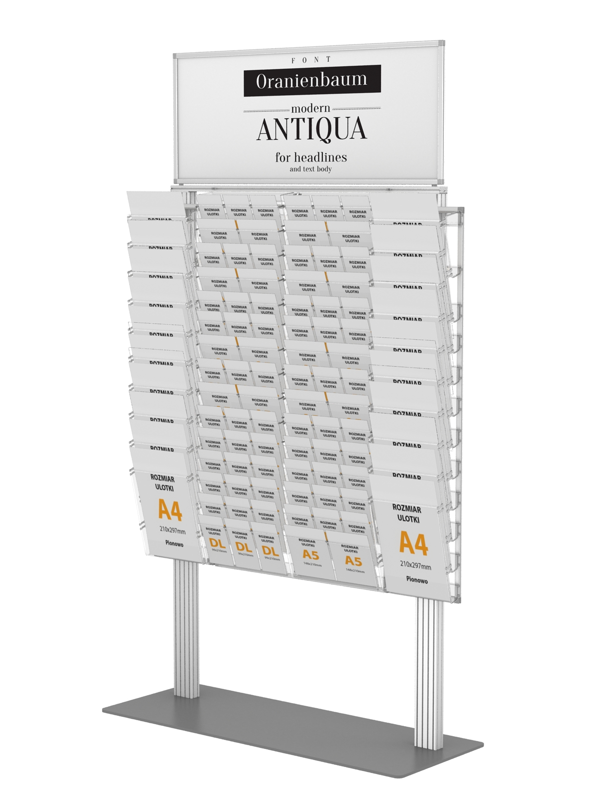 - dowolność modyfikacji stojaka w zależności od potrzeb (kieszeń A4 poziom zapewnia ekspozycję również dwóch ulotek formatu A5 lub trzech formatu DL),