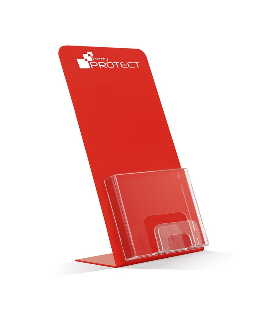 Stojak na ulotki DL czerwony z wizytownikiem i logo | ![]() |