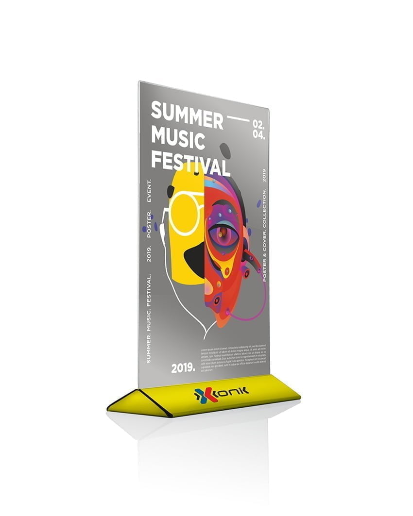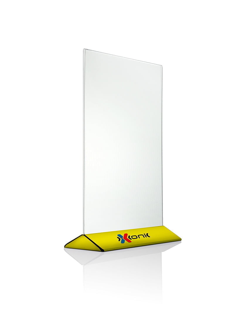 Stojak akrylowy o lekkim kącie nachylenia. Dzięki minimalistycznemu wyglądowi, idealnie sprawdzi się w nowoczesnych pomieszczeniach. Sprawdzi się do postawienia na stole/ladzie we wnętrzach różnych instytucji publicznych, np. w bankach, hotelach, recepcjach itp. Szeroka podstawa o ciekawym designie gwarantuje stabilność.