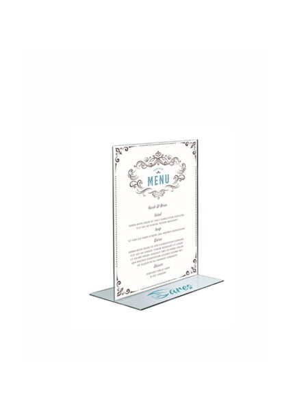 Stojak informacyjny A7 typ T – stojaki na menu wykonane z najwyższej jakości bezbarwnego materiału z logo.