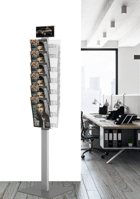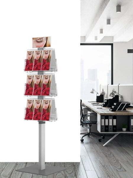 Stabilny, wolnostojący, prezenter na ulotki, foldery w wersji dwustronnej. Sześć ulotek A4 (możliwe inne formaty ) widocznych w 100%. Rama z anodowanego aluminium, kieszonki z plexi. Pozioma tabliczka DL nad ulotkami do umieszczenia logo lub innej informacji na kartce formatu DL. Stojak posiada możliwość zamontowania w nim na stałe po jednym egzemplarzu ulotki. Takie ulotki (przytrzymane sztywną folią) ułatwią klientom orientację, a obsłudze uzupełnianie ulotek.
