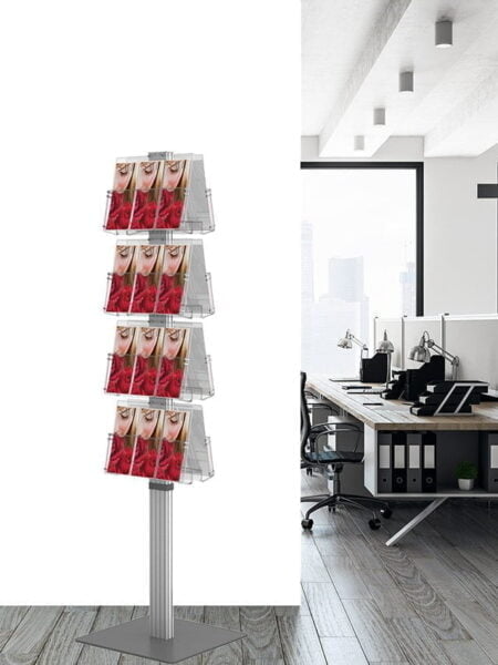 Stabilny, wolnostojący, prezenter na ulotki, foldery. Cztery ulotki A4 (możliwe inne formaty) widoczne w 100%. Rama z anodowanego aluminium, kieszonki z plexi.