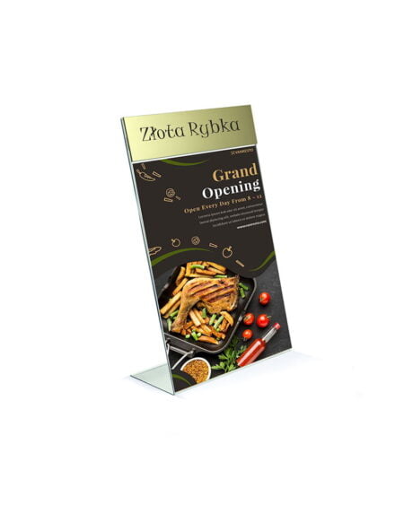 Stojak na informacje A5 z logo – stojaki na menu typ L wykonane z najwyższej jakości plexi Akrylon XT.